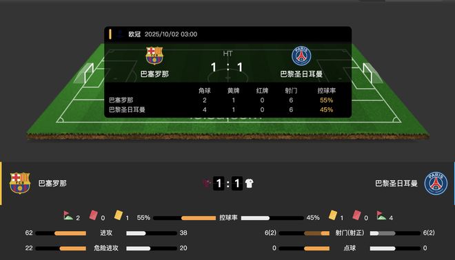- 欧冠 | 巴萨vs巴黎半场数据:双方均6次射门2次射正,控球率巴萨领先