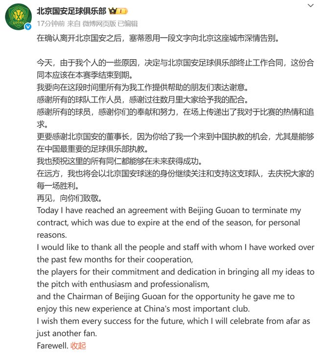 今天,由于我个人的一些原因,决定与北京国安足球俱乐部终止工作合同,这份合同本应该在本赛季结束到期。 我要向在这段时间里所有为我工作提供帮助的朋友们表达谢意。 感谢所有的球队工作人员,感谢过往数月里大家给予我的配合。 感谢所有的球员,感谢你们的奉献和努力,在场上传递出了我对于比赛的热情和追求。 更要感谢北京国安的董事长,因为你给了我一个来到中国执教的机会,尤其是能够在中国最重要的足球俱乐部执教。 我也预祝这里的所有同仁都能够在未来获得成功。 在远方,我也将会以北京国安球迷的身份继续关注和支持这支球队,去庆祝大家的每一场胜利。 再见,向你们致敬。