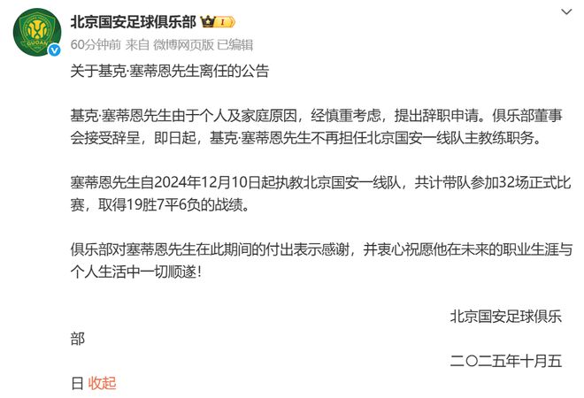 10月5日晚,北京国安官方发布关于主帅基克·塞蒂恩的离任公告。原文如下: