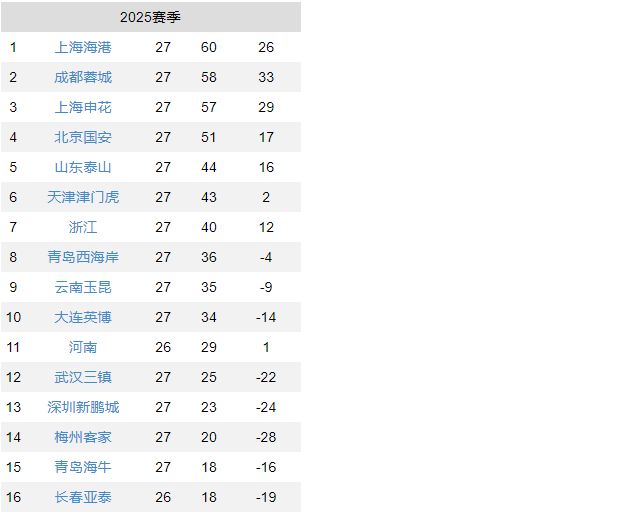 - 中超 | 随着海港43,蓉城31,申花21,中超最新积分榜如下,前三差3分