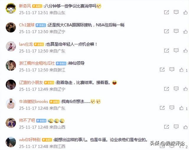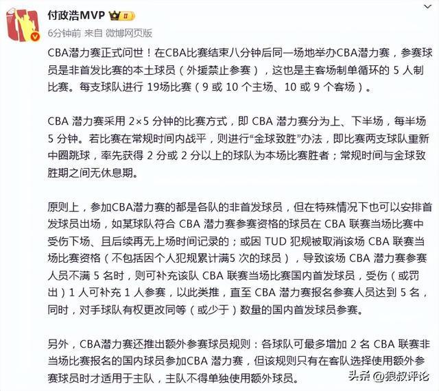 媒体人付政浩发文点评:“CBA 潜力赛采用 2×5 分钟的比赛方式,即 CBA 潜力赛分为上、下半场,每半场 5 分钟。若比赛在常规时间内战平,则进行“金球致胜”办法,即比赛两支球队重新中圈跳球,率先获得 2 分或 2 分以上的球队为本场比赛胜者;常规时间与金球致胜期之间无休息期。原则上,参加CBA潜力赛的都是各队的非首发球员,但在特殊情况下也可以安排首发球员出场,如某球队符合 CBA 潜力赛参赛资格的球员在 CBA 联赛当场比赛中受伤下场、且后续再无上场时间记录的;或因 TUD 犯规被取消该场 CBA 联赛当场比赛资格(不包括因个人犯规累计满5 次的球员),导致该场 CBA 潜力赛参赛人员不满 5 名时,则可补充该队 CBA 联赛当场比赛国内首发球员,受伤(或罚出)1 人可补充 1 人参赛,以此类推,直至 CBA 潜力赛报名参赛人员达到 5 名,同时,对手球队有权更改同等(或少于)数量的国内首发球员参赛。另外,CBA潜力赛还推出额外参赛球员规则:各球队可最多增加 2 名 CBA 联赛非当场比赛报名的国内球员参加CBA 潜力赛,但该规则只有在客队选择使用额外参赛球员时才适用于主队,主队不得单独使用额外球员。双方球队必须在本场 CBA 联赛比赛中场休息结束前 4 分钟内,向记录台提交本场 CBA潜力赛的球员名单,参赛球员不超过 9 名球员、不少于 5 名球员;当某球队出现须由国内首发球员补充参赛的情况,则须在 CBA 联赛该场比赛结束后1分钟内向记录台提交更换申请,并通知参赛对手确认是否进行人员更换;如某球队因伤病等原因,赛前比赛球员人数不足 5 人则视为弃权。”对于这个赛后的方案,实际上争议比较大的地方是赛后的8分钟进行,仿佛是强行填补了从48分钟改成40分钟的规则。