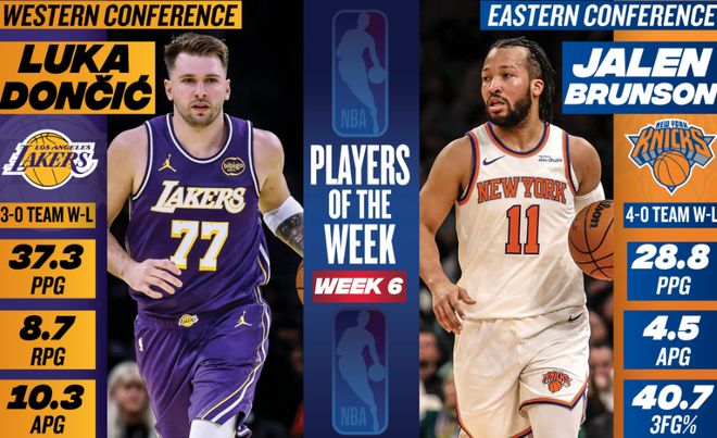 第一则:周最佳球员诞生,布伦森东契奇当选NBA官方公布了第6周的东西部周最佳球员,东部由尼克斯后卫布伦森当选,西部由湖人后卫东契奇当选。布伦森上周场均贡献28.8分+4.5助攻,带领尼克斯取得4胜0负的战绩。据统计,这是布伦森生涯第8次当选周最佳球员。东契奇上周场均爆砍37.3分+8.7篮板+10.3助攻,带领湖人取得3胜0负的战绩。据统计,这是东契奇生涯第15次获此殊荣。值得一提的是,贝恩、布朗、希罗、杰伦约翰逊、西亚卡姆、埃迪、华子、亚历山大、穆雷和里夫斯等球星获得了周最佳提名。