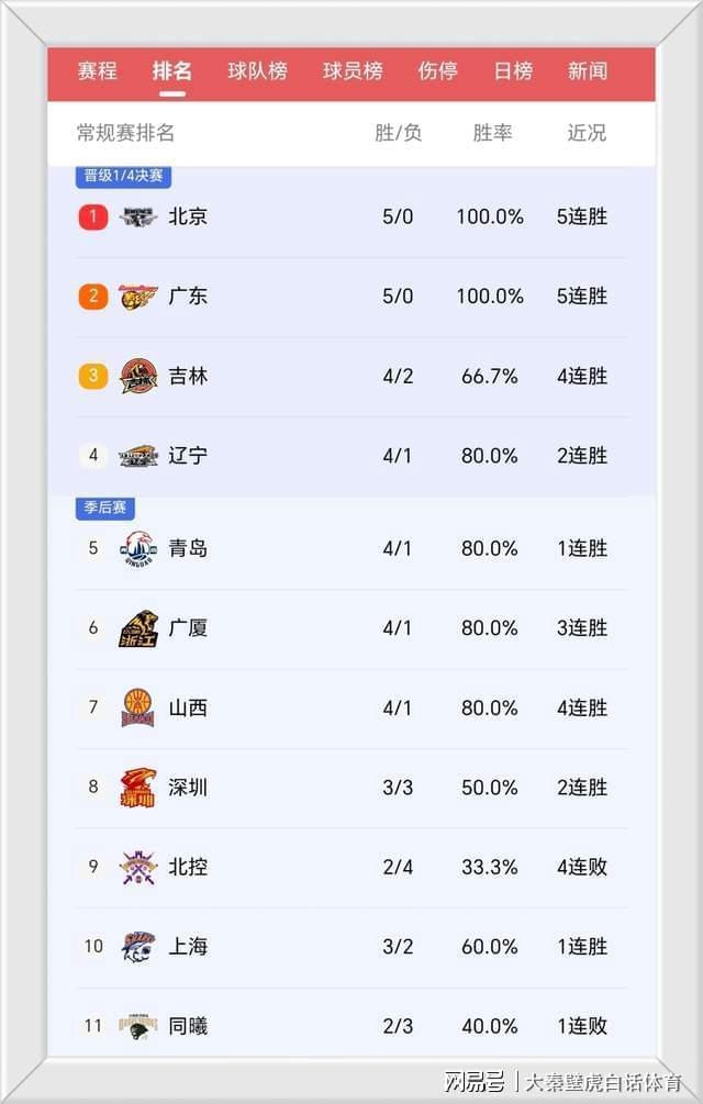 吉林队主场87-73大胜北控男篮,凭借先胜一轮的优势,将排名杀进三甲。经过24日晚的比赛之后,积分榜再次出现变化。①、北京男篮和广东男篮继续以不败战绩占据排名前两位;②、吉林队化身大黑马,力压辽宁男篮,首次跻身前三;③、青岛队4胜1负冲上第5名,将卫冕冠军广厦男篮压在身后;④、全华班出战的四川男篮一胜难求,成为唯一开赛6连败的球队。具体排名如下,大家怎么看?