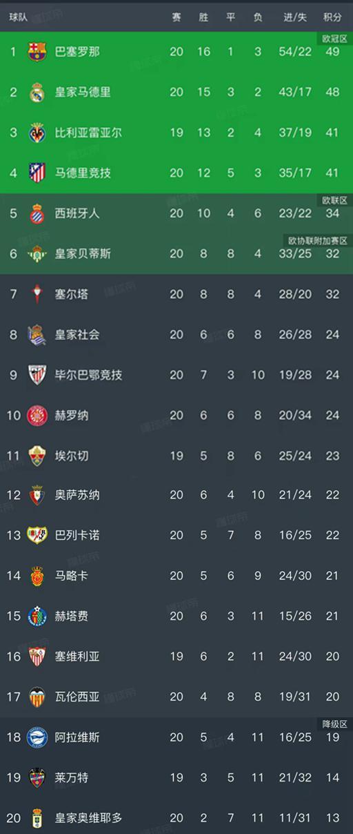 - 西甲 | 西甲第20轮结束了9场比赛,最新积分榜如下!